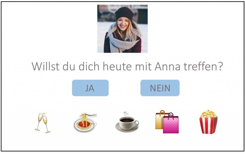 Die Aktivitäten werden in Form von Emoji’s vorgeschlagen, wie zum Beispiel Fußballspielen, Kaffee trinken oder Essen gehen. Wenn du dich für eine Aktivität mit einem Freund entschieden hast, wird dieser nur benachrichtigt, wenn auch er sich mit dir treffen möchte. Möchte er sich nicht mit dir treffen, wird er also nichts von deiner Anfrage erfahren.
