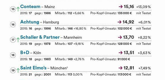 Im offiziellen Ranking von W&V kletterte die Mannheimer Agentur von Platz 19 im vergangen Jahr auf Platz 17 der erfolgreichsten inhabergeführten Werbeagenturen in Deutschland. Für Baden-Württemberg heißt das, dass Schaller & Partner weiterhin die Nr.1 bleibt. Auch in der gesamten Metropolregion Rhein Neckar ist sie die einzige Agentur, die es unter die Top 50 der größten Werbeagenturen Deutschlands geschafft hat.